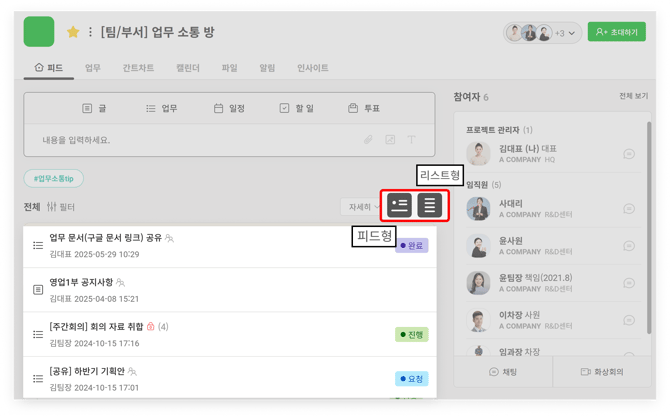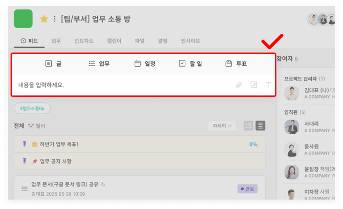 프로젝트 내 등록된 게시물(글/업무/일정/할 일/투표)을 종류별로 필터링하여 모아볼 수 있습니다.