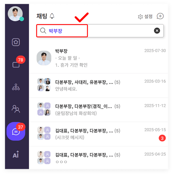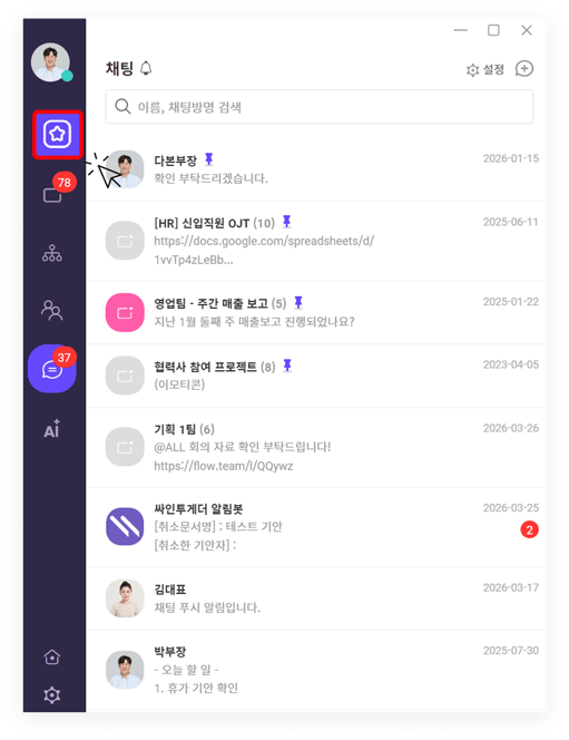 자주 소통하는 팀원 또는 채팅방을 즐겨찾기 설정할 수 있습니다. 좌측 탭에서 '즐겨찾기' 아이콘을 선택하면 즐겨찾기 설정된 직원과 채팅만을 따로 모아서 확인할 수 있습니다.