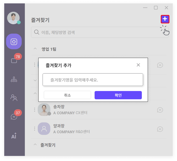 우측 상단 '+' 아이콘을 선택하여 즐겨찾기 이름(라벨)을 입력한 뒤 확인을 누르면 새로운 즐겨찾기 그룹이 추가됩니다.