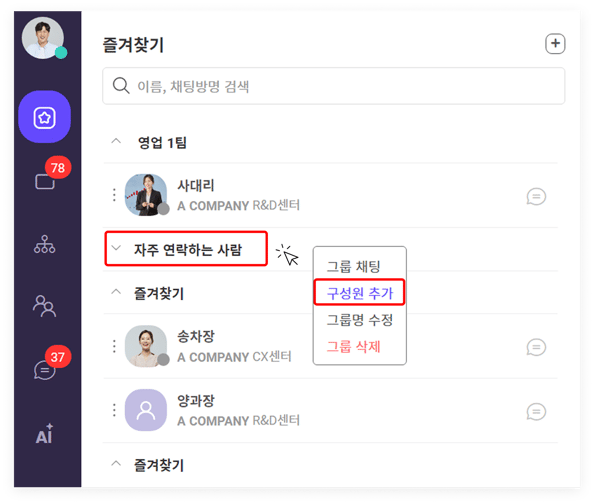 생성된 즐겨찾기 그룹 항목에서 마우스 오른쪽 버튼을 클릭하면 해당 그룹에 구성원을 추가할 수 있습니다.