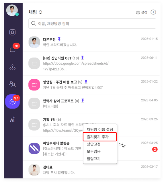 채팅방 영역에서 마우스 오른쪽 버튼을 클릭하면 채팅방을 즐겨찾기에 추가할 수 있습니다.