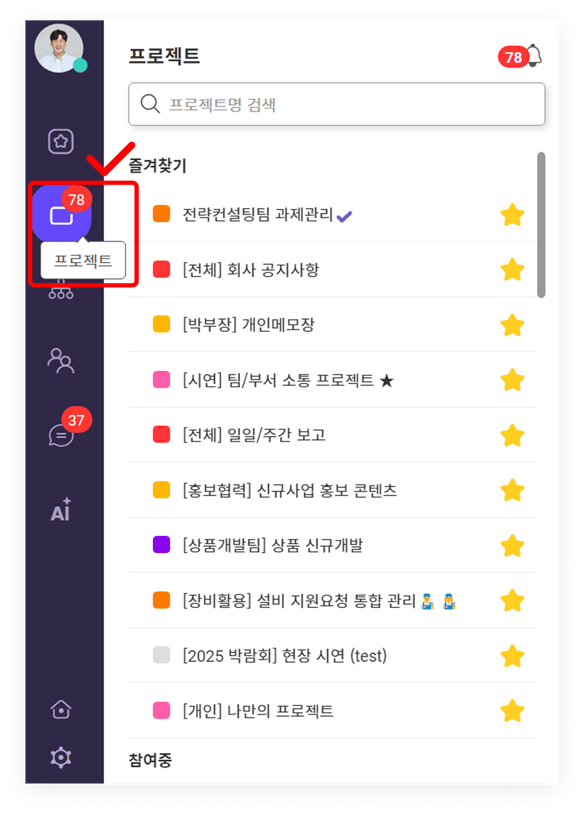 전체창 모드에서 상단 고정한 프로젝트는 미니 창 모드에 동일하게 적용됩니다. 프로젝트의 우측 별 모양 아이콘을 선택하면 노란색으로 전환되어 상단 고정이 완료됩니다.