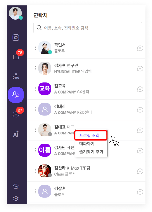 프로필 사진을 선택하거나 마우스 오른쪽 버튼 클릭 후 '프로필 조회'를 선택하면 프로필 내용을 확인할 수 있습니다. 프로필에서 채팅이나 화상회의를 바로 시작할 수 있습니다.
