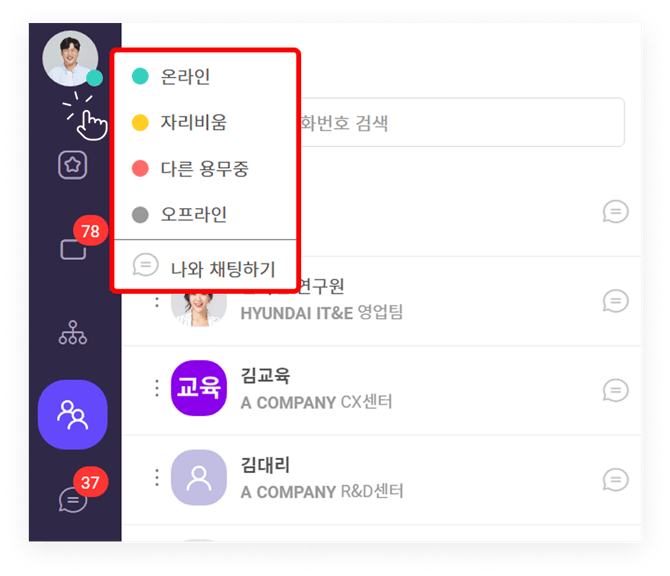 미니 모드를 사용하고 있는 사용자끼리 접속 상태를 확인할 수 있습니다. (베타 모드로 웹에서는 지원하지 않는 기능입니다. ) 초록색은 로그인, 노란색은 자리비움(10분 이상 활동이 없는 경우), 회색은 오프라인을 의미합니다.