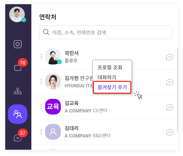 팀원 연락처 정보에서 마우스 오른쪽 버튼 클릭 후 '즐겨찾기 추가'를 선택합니다. 생성되어 있는 즐겨찾기 그룹 중 원하는 항목을 선택하여 해당 팀원을 즐겨찾기 그룹에 바로 추가할 수 있습니다.