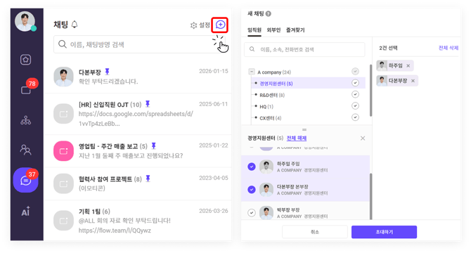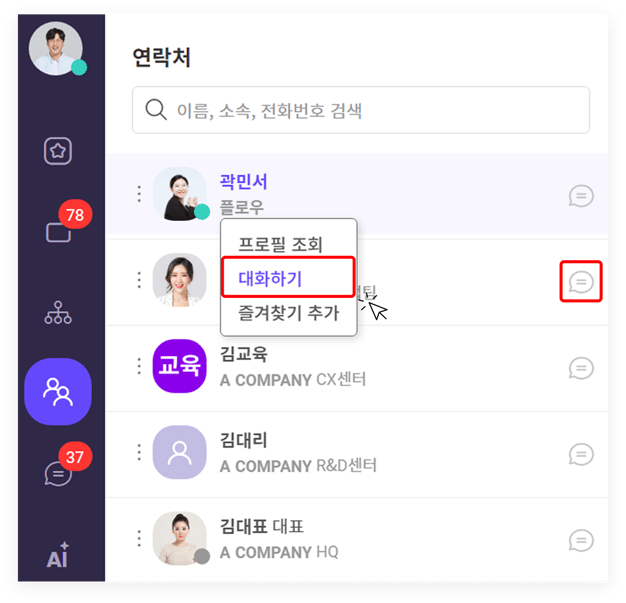 마우스 오른쪽 버튼 클릭 후 '대화하기'를 선택하거나 말풍선 아이콘 선택 후 채팅을 시작할 수 있습니다.