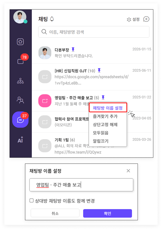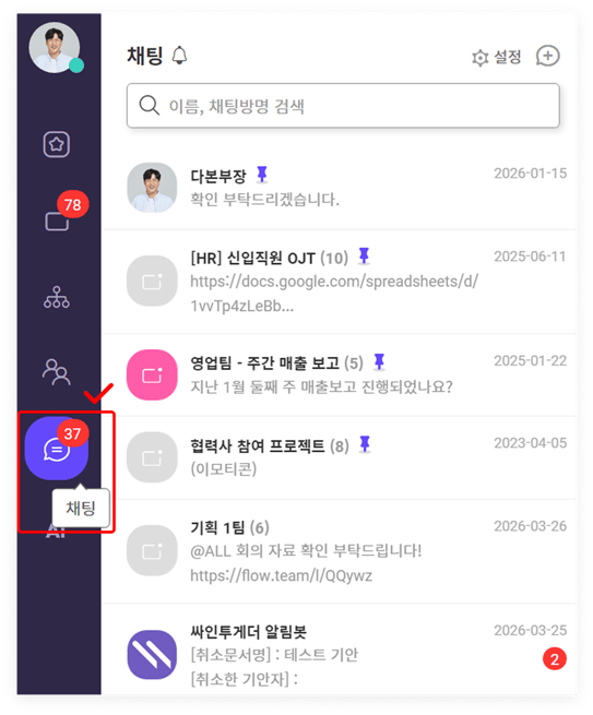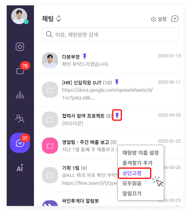 자주 소통하는 채팅방을 가장 먼저 확인할 수 있도록 상단 고정할 수 있습니다. 채팅방에서 마우스 오른쪽 버튼 클릭 후 '채팅방 상단 고정'을 선택하면 핀 모양 아이콘이 추가되어 상단 고정됩니다.