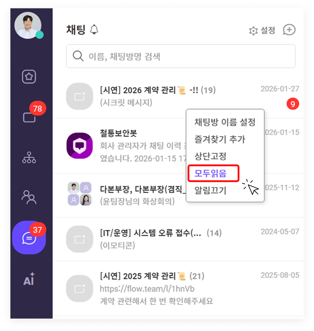 채팅 항목에서 마우스 오른쪽 버튼 클릭 후 '모두 읽음 처리' 선택 시 해당 채팅방에서 읽지 않은 메세지를 모두 읽음 처리하실 수 있습니다.-png.png?width=620&height=655&name=Group%201410108336%20(1)-png.png)