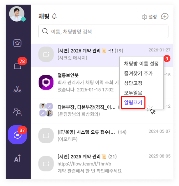 채팅 항목에서 마우스 오른쪽 버튼 클릭 후 '알림 끄기' 선택 시 채팅방의 알림을 비활성화하고, '알림 켜기' 선택 시 알림을 활성화할 수 있습니다.
