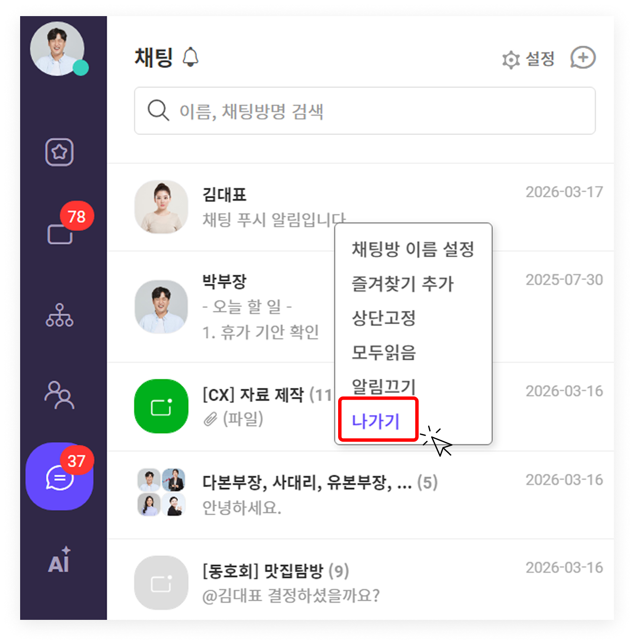 채팅 항목에서 마우스 오른쪽 버튼 클릭 후 '나가기' 선택 시 해당 채팅방에서 퇴장할 수 있습니다. 단, 프로젝트 채팅방의 경우 프로젝트에 추가되거나 퇴장할 시 채팅방에도 함께 반영되어 나가기 처리가 어렵습니다.