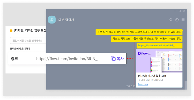 '링크 복사' 버튼을 누르면 바로 프로젝트 링크가 복사되며, 해당 링크를 초대 대상에게 메신저나 이메일 등으로 전달하면 우리 직원 뿐만 아니라 외부 직원도 쉽게 초대할 수 있습니다.