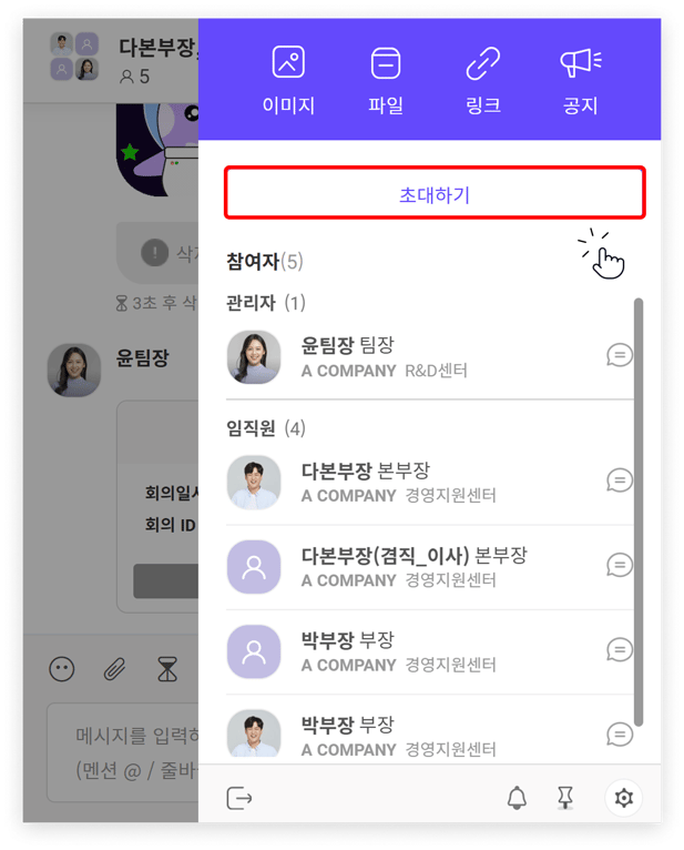 TIP. 조직도가 설정되어 있는 경우, 부서(팀) 단위로 참여자를 한 번에 초대할 수 있습니다. (조직도 관리 기능 자세히 보기)