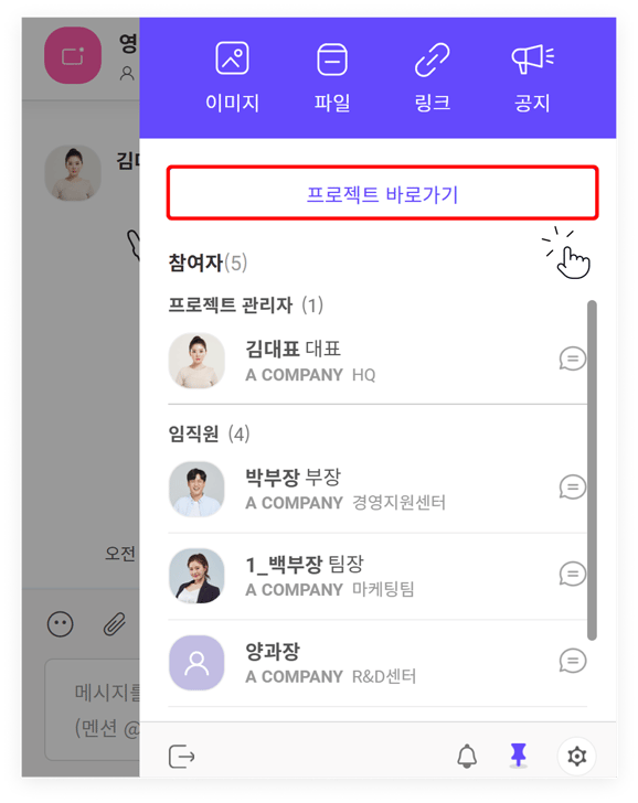 ) 버튼을 눌러 '프로젝트 바로가기' 버튼을 클릭하면 연결된 프로젝트로 바로 이동할 수 있습니다. 채팅으로 대화 중 업무 등록이 필요한 경우, 빠르게 이동해보세요.