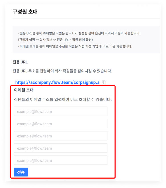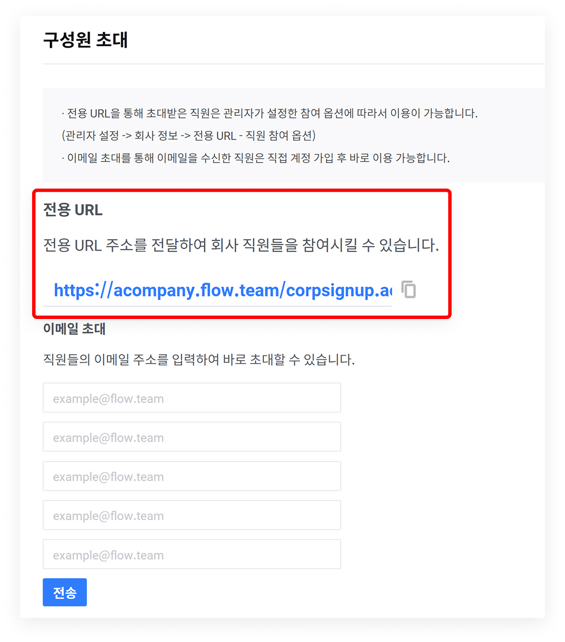 기업 내 전체 관리자는 직원들이 플로우에 직접 가입하도록 초대할 수 있습니다. 가입 시 만든 우리 회사의 URL을 복사하여 전달하거나 직원의 이메일로 초대장을 발송할 수 있습니다.