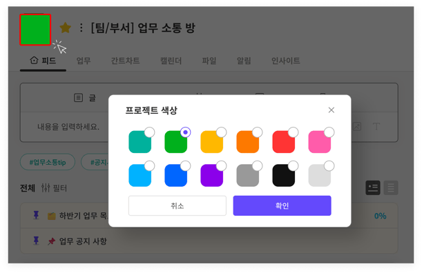 각 프로젝트 내부 좌측 상단에 위치한 네모 모양의 '색상 박스'를 선택하면 원하는 색상을 설정할 수 있습니다.