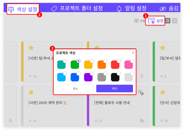 프로젝트의 유형 혹은 특징별로 프로젝트 색상을 설정할 수 있습니다. 프로젝트 색상은 개별적으로 적용되는 기능이며, 각 프로젝트에서 설정하거나 여러 개의 프로젝트를 일괄로 설정할 수도 있습니다.