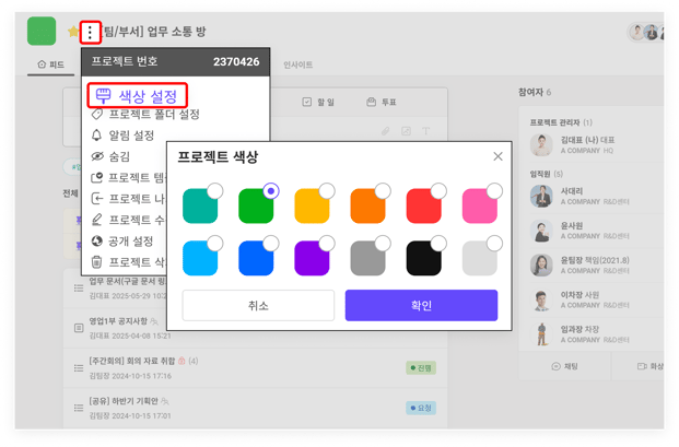 각 프로젝트 별로 접속하여 색상 박스 또는 '더보기' 항목에서 색상을 설정할 수 있습니다.