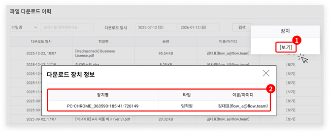 파일 다운로드 이력 화면 우측의 '장치' 영역에서 '보기'를 누르면(①), 다운로드 장치 정보 팝업창이 나타납니다. 장치명과 다운로드한 직원의 이름 / 아이디를 확인할 수 있습니다(②).