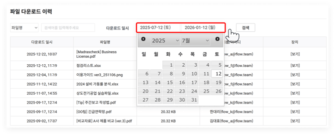 날짜 영역에서 특정 일자를 설정한 뒤, 원하는 기간 내 다운로드 이력을 선별 조회할 수 있습니다.