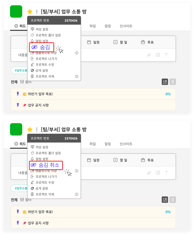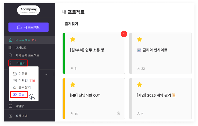 프로젝트 내 '더보기(점 세개)' 항목에서 '숨김'을 선택하여 프로젝트를 숨길 수 있으며, 숨김 설정을 취소할 수도 있습니다.