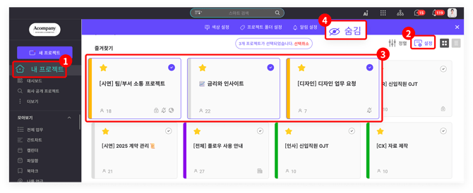 내 프로젝트 화면 우측 상단의 '설정'을 누르면 여러 개의 프로젝트를 한 번에 선택하여 숨길 수 있습니다. 아래 이미지에 표시된 순서에 맞게 진행하면 됩니다.