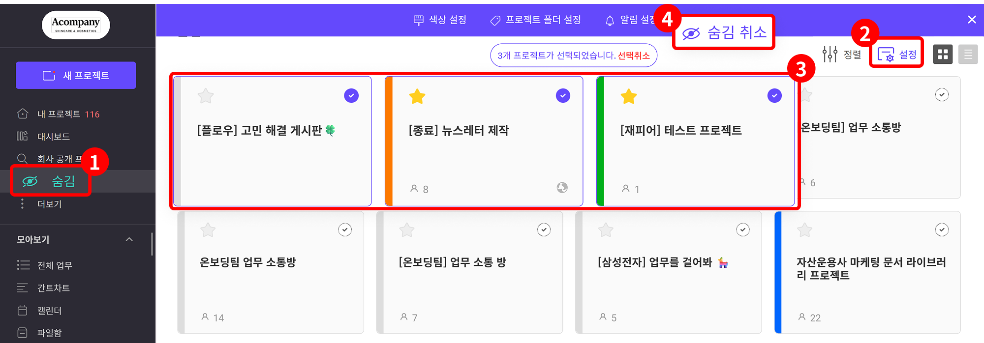 숨긴 프로젝트를 모아보는 화면에서 우측 상단의 '설정'을 선택하면 프로젝트를 선택하여 숨김을 해제할 수 있습니다. 아래 이미지에 표시된 순서에 맞게 진행하면 됩니다.