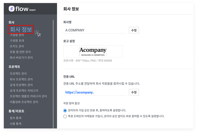 관리자 설정 페이지 내의 '회사 정보'를 선택하면 회사 정보를 수정할 수 있습니다. 가입 시 설정한 '회사명'과 '전용 URL'을 수정할 수 있습니다.