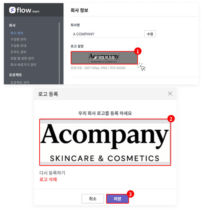 '+로고 설정'을 누르고(①), 등록 화면에서 이미지를 첨부한 뒤(②) '저장' 버튼을 누르면(③) 회사 로고 이미지를 등록할 수 있습니다. 등록된 로고는 플로우 화면 좌측 상단의 '홈 바로가기' 메뉴에 적용됩니다.