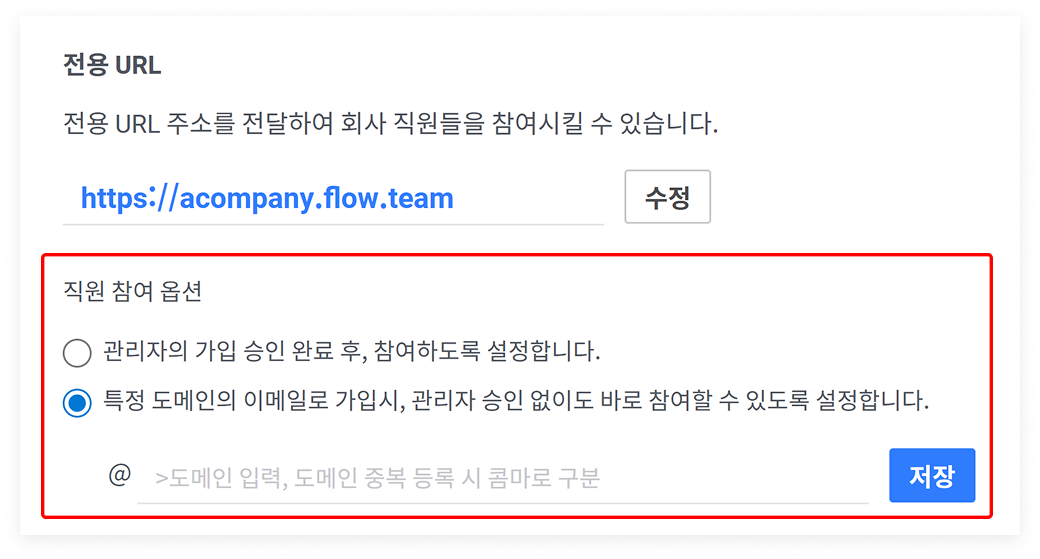 직원의 참여를 엄격하게 관리하기 원할 때 사용하기 좋은 옵션입니다. - 특정 도메인의 경우 승인 절차 건너뛰기