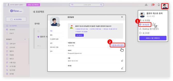 사용 중인 게스트 계정에 로그인한 후, 플로우 화면 우측 상단의 프로필 아이콘을 선택하여 '환경설정 > 기존회사에 참여하기'를 선택합니다.