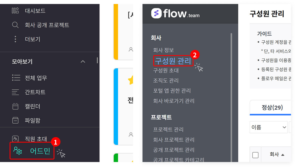 플로우 로그인 후, 메인 화면 좌측 하단의 '어드민'을 선택하여 관리자 페이지로 이동하신 다음(①), '구성원 관리' 메뉴를 선택(②)합니다.