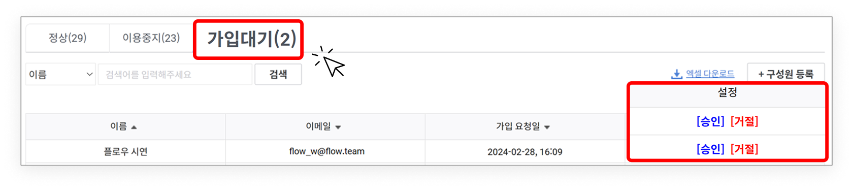 회사 계정에 가입 요청 후 대기 중인 구성원은 관리자의 승인이 있어야만 가입이 정상 완료됩니다. 구성원 목록 화면 상단의 '가입대기' 탭을 선택하면 대기 중인 구성원 목록을 확인할 수 있으며, 가입을 승인하거나 거절할 수 있습니다.