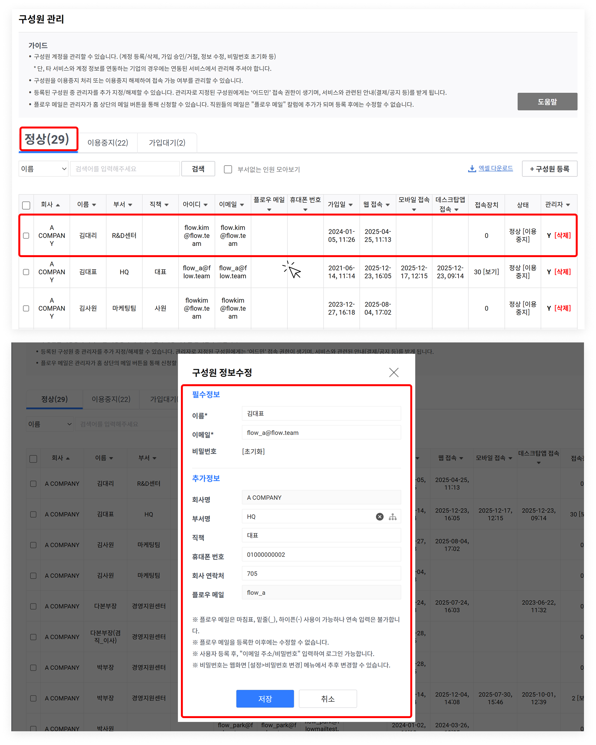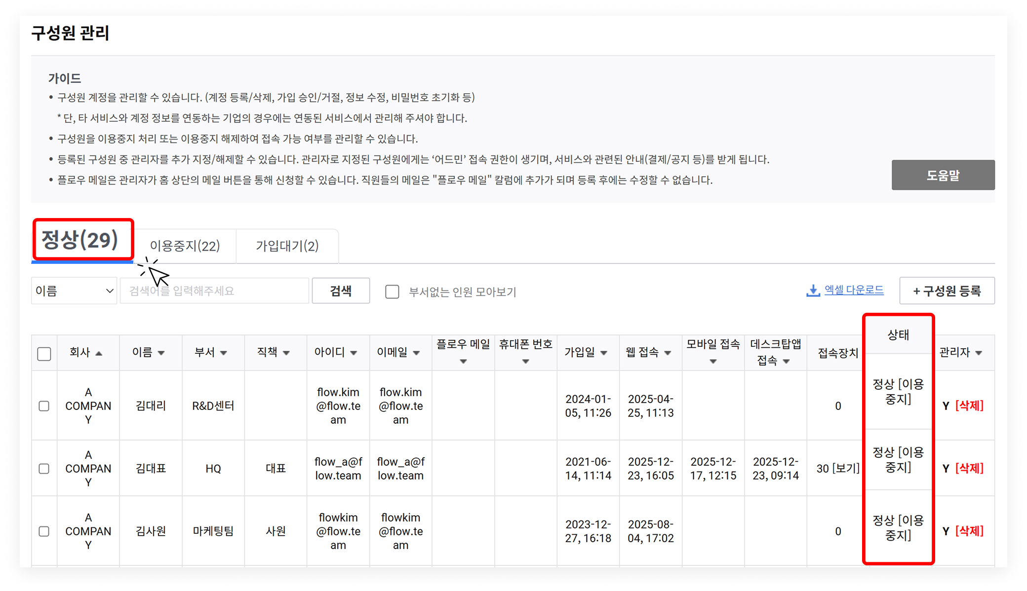 구성원 관리 화면 상단의 '정상' 탭을 누르면, 현재 기업 내에서 플로우를 이용 중인 구성원 목록을 확인할 수 있습니다.여기서 휴직 중인, 혹은 퇴사한 구성원은 '이용중지' 처리할 수 있습니다. 상태 항목에서 '이용중지'를 선택하면 바로 처리되며, 해당 구성원은 더 이상 로그인 및 이용이 불가하게 됩니다.