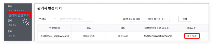 어드민 메뉴 중, '로그>관리자 변경 이력'에서 삭제된 계정의 이력을 상세히 확인할 수 있습니다. 삭제된 계정은 변경 이력에서 '계정삭제'로 표시됩니다.