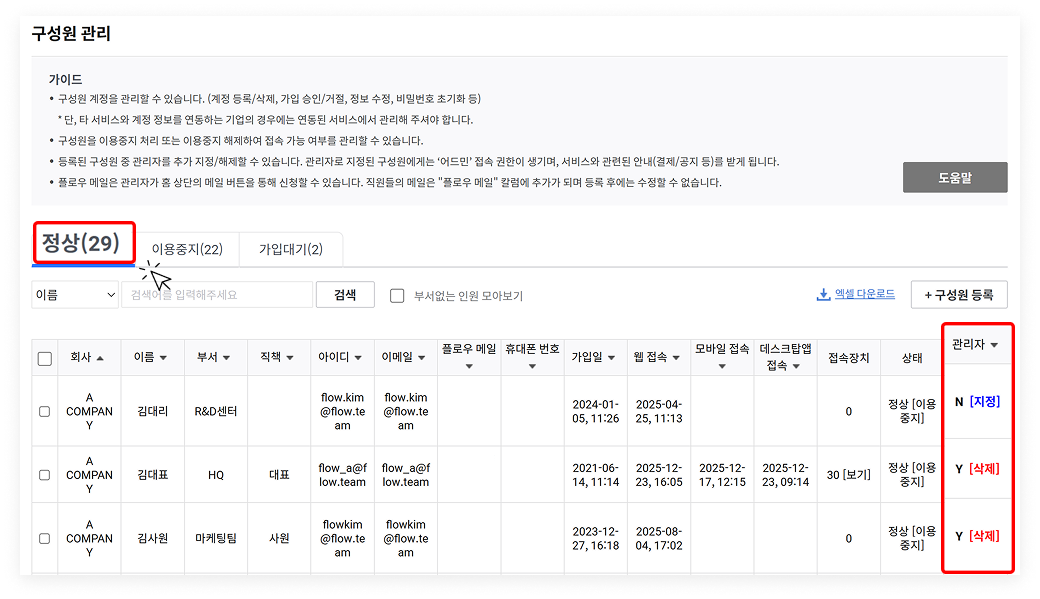 - 관리자는 인원에 제한 없이 기업 내 '정상' 등록 인원 내에서 편하게 추가 지정할 수 있습니다.