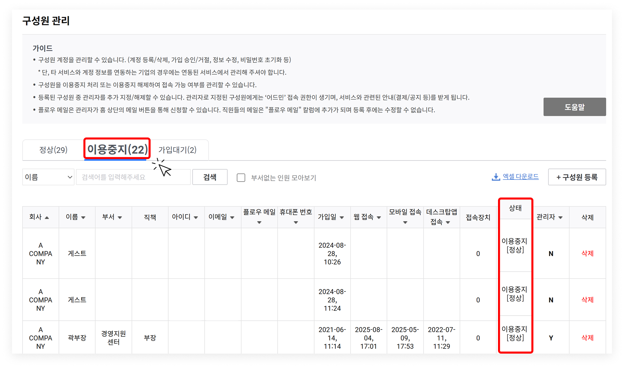 구성원 관리 화면 상단의 '이용중지' 탭을 선택하면, 이용중지 처리된 구성원 목록을 확인할 수 있습니다. 이용중지를 해제하기 원하는 구성원 목록에서 상태 항목의 '정상' 부분을 누르면 바로 이용중지가 해제됩니다. 해당 구성원은 바로 다시 로그인할 수 있습니다.