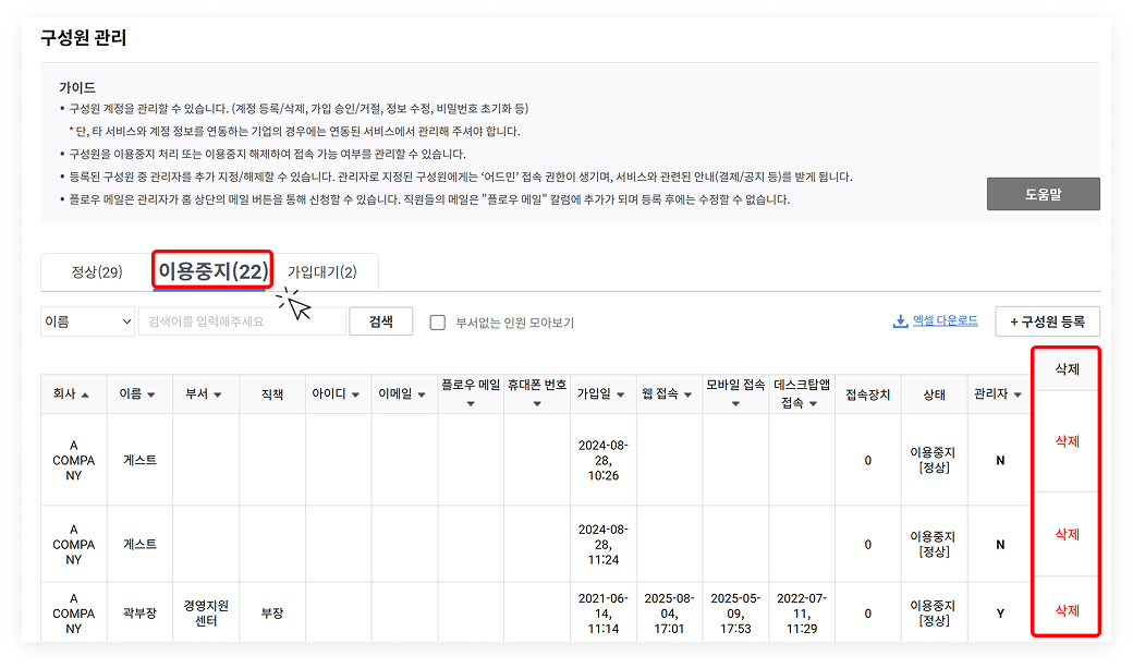 - 이용중지 처리가 된 계정만 삭제 가능합니다.
