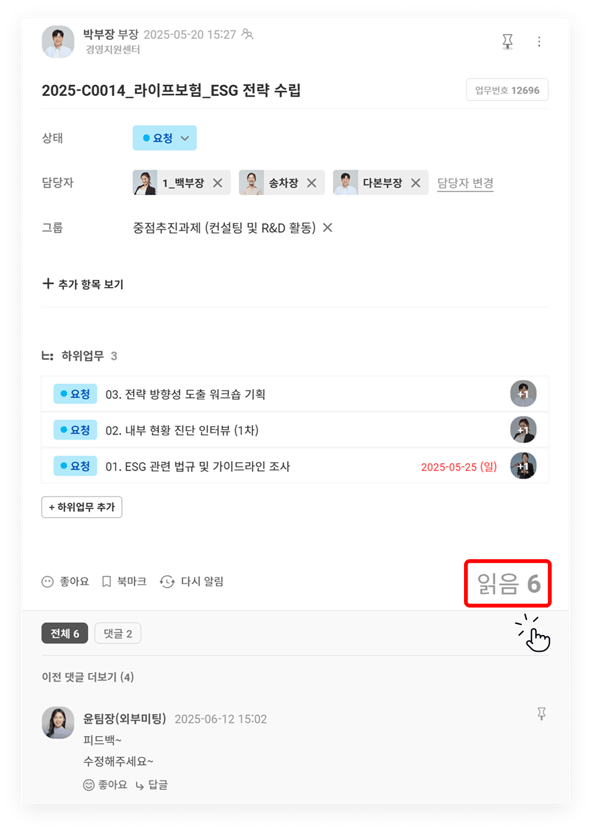 - 글, 업무, 일정, 할일, 투표 게시물 모두 '읽음 확인' 기능이 제공됩니다.