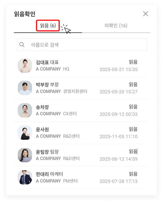 게시물 우측 하단에 있는 '읽음' 부분을 클릭하여 읽은 사람 / 읽지 않은 사람을 각각 빠르게 확인할 수 있습니다. 읽은 사람을 확인할 때 '게시물을 읽은 시간'까지 체크할 수 있습니다.