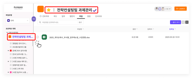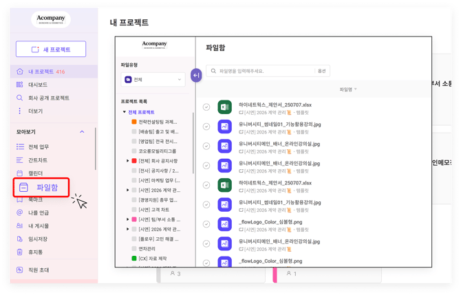파일함 화면 왼쪽의 프로젝트 목록에서 프로젝트를 선택하면 해당 프로젝트 내의 파일함으로 이동합니다.