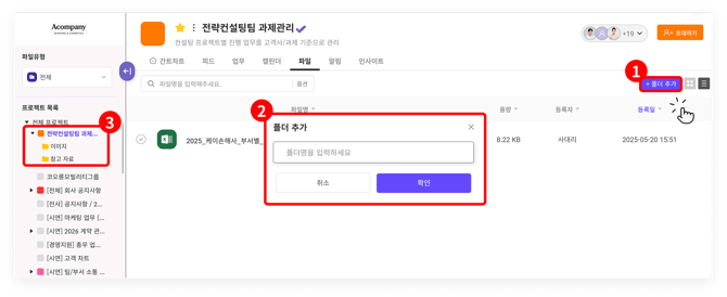 프로젝트별 파일함에서는 우측 상단의 '폴더 추가(①) 버튼을 눌러 '폴더를 추가해서(②) 파일을 관리할 수 있습니다. 만들어진 폴더는 프로젝트 목록에서 함께 확인할 수 있습니다(③).-png-1.png?width=670&height=275&name=Group%201410107648%20(1)-png-1.png)