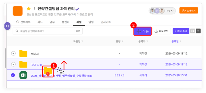 파일을 선택하여 드래그하거나(①), 또는 우측 상단의 '이동' 버튼을 눌러 원하는 폴더로 옮길 수 있습니다(②).