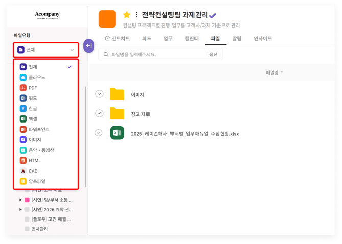 파일함에서는 참여 중인 모든 프로젝트에 등록된 파일을 한 번에 모아서 확인할 수 있으며, 프로젝트 별로도 모아서 확인할 수 있습니다.