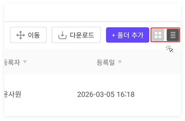 파일 모아보기 페이지의 우측 상단에 있는 아이콘을 선택하면 파일 보기 모드를 변경할 수 있습니다. 좌측에 있는 아이콘은 '바둑판형(