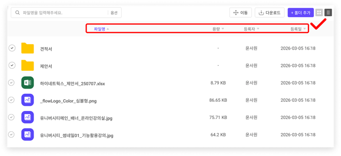파일 목록을 파일명/최근 업로드 순/파일 사이즈/등록자 기준으로 정렬할 수 있습니다. 각 항목 우측에 있는 세모(▲ 또는 ▼) 아이콘을 선택하면 파일을 오름차순 또는 내림차순으로 정렬할 수 있습니다.-png.png?width=670&height=309&name=Group%201410107658%20(1)-png.png)