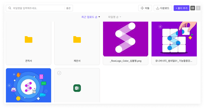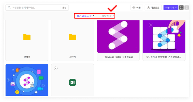 파일 목록을 파일명/최근 업로드 순 등의 기준으로 정렬할 수 있습니다. 보기 모드에 따라 정렬할 수 있는 필터가 다릅니다.