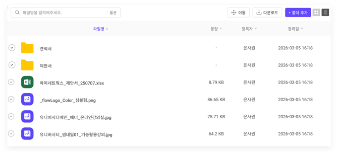 플로우 메인 화면 좌측의 '파일함' 메뉴를 누르면 현재 참여 중인 모든 프로젝트에 첨부된 파일을 조회할 수 있습니다.