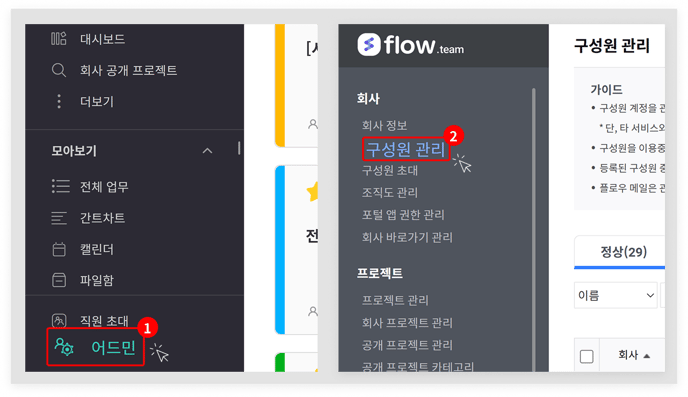 좌측 하단의 '어드민'을 선택하여 관리자 페이지로 이동한 후, '구성원 관리'를 선택합니다.
