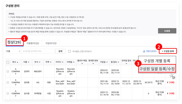 여러 명의 구성원 계정을 등록하거나, 혹은 수정해야 하는 경우 활용하기 좋은 기능입니다.