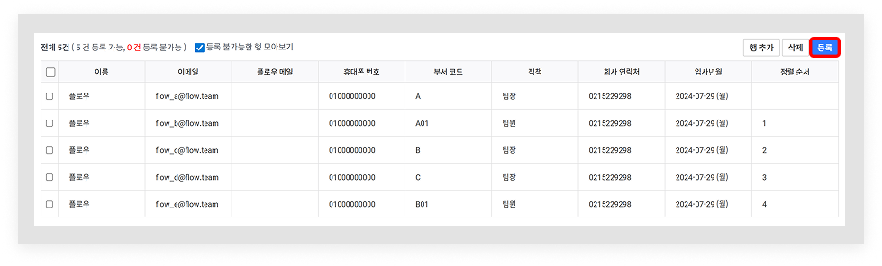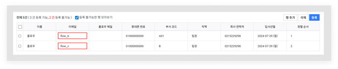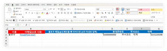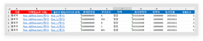 예를 들어 '이름 홍길동, 이메일 주소: flow_b@flow.team, 부서 코드가 161'로 등록되어 있는 구성원의 정보가 있습니다. 동일한 구성원의 정보를 다시 업로드할 때 부서 코드를 빈 값으로 추가하면, 등록된 부서 코드(부서 정보)가 삭제된 상태로 업데이트됩니다.